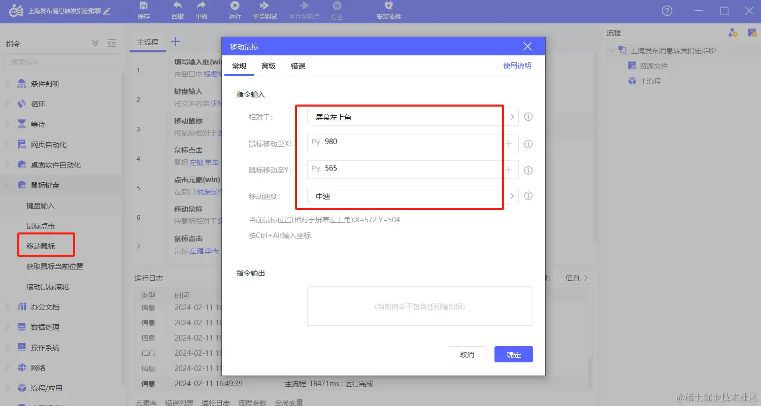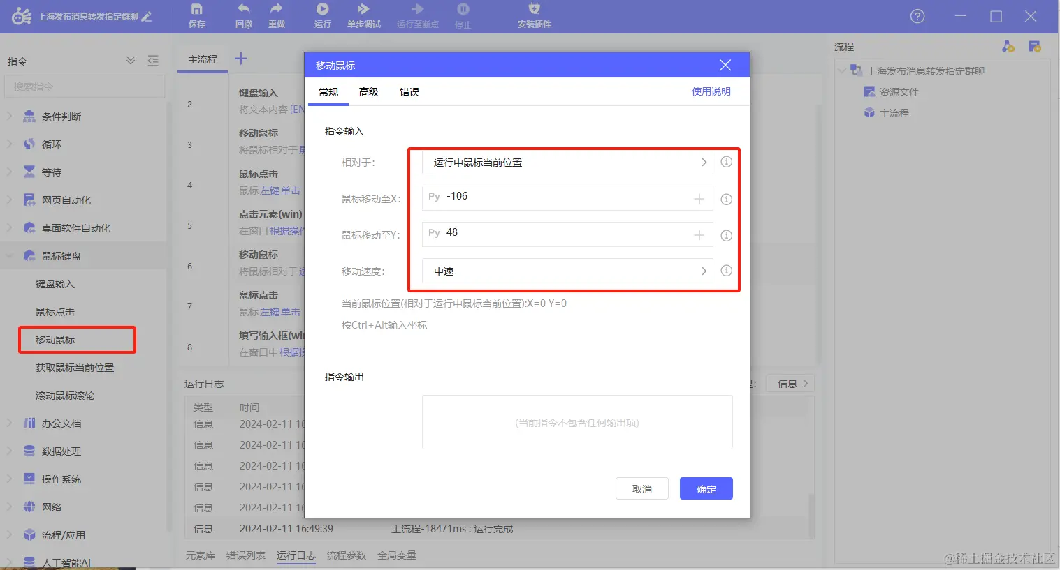 这里使用移动鼠标指令,与上个不同的是,这里是相对鼠标位置进行偏移,具体参数如图