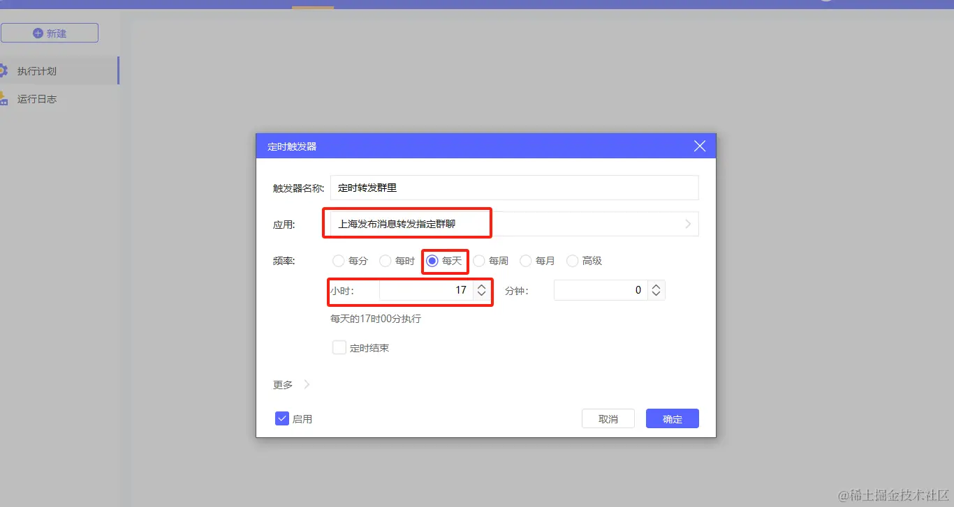 发版后,触发器的应用就可以选择到了,选择刚刚发版的应用,设定好执行的时间,就可以静静等待执行了,图中是每天下午5点执行