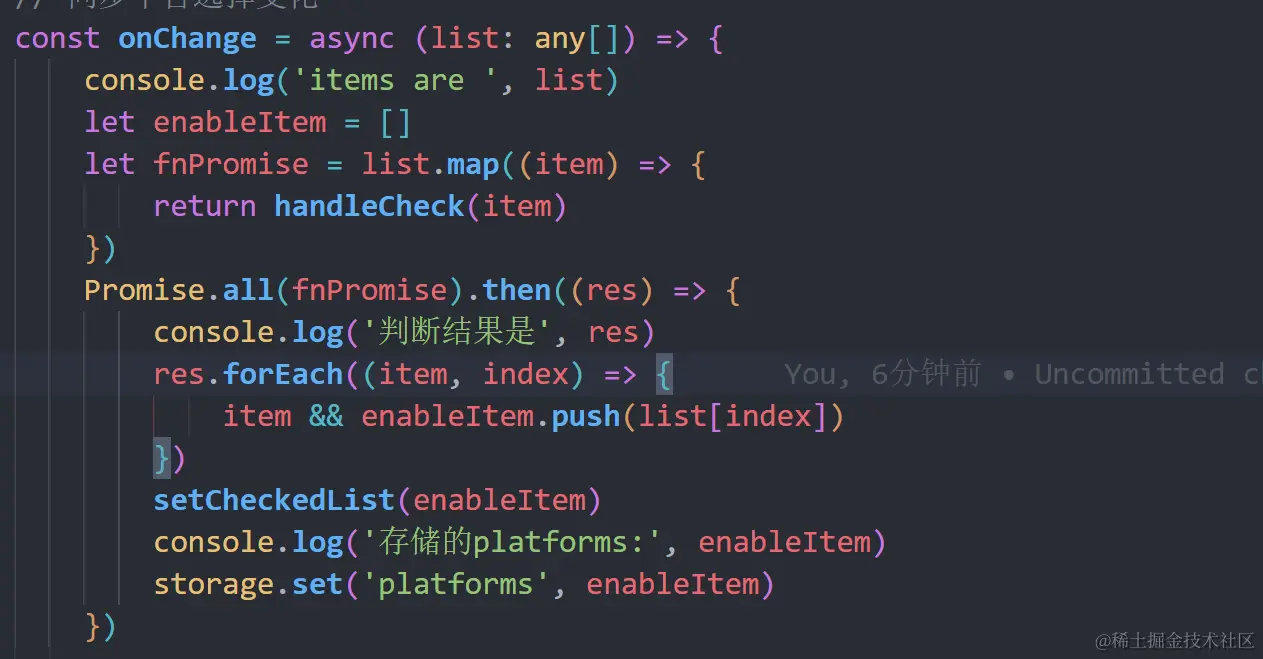 需要改造为等所有的异步的handleCheck执行完,再调用本地存储函数: