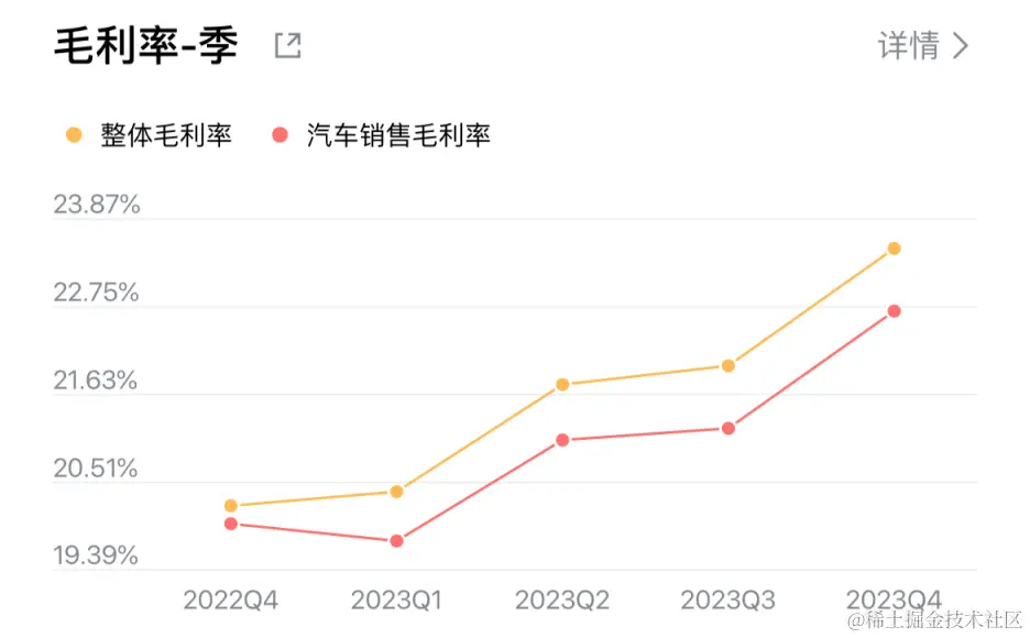 开源节流下,理想汽车毛利率实现了大幅增长,毛利率水平从2022年年末的19.4%增长至2023年年末的22.2%,同期车辆毛利率也从19.1%上升至21.5%。也就是说,如果以理想汽车35万元最终成交价来计算,相当于每卖出一辆车毛利7.5万元。
