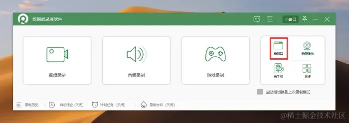 步骤1:打开数据蛙录屏软件,你可以看见一个简洁直观的用户页面,录制微课推荐使用 “录窗口” 模式。