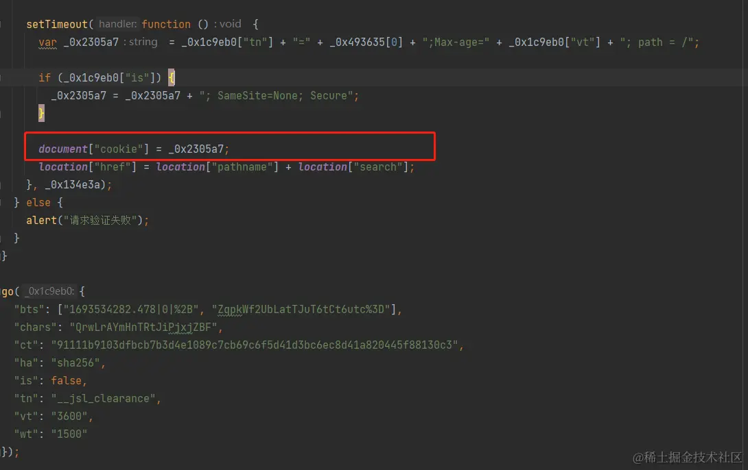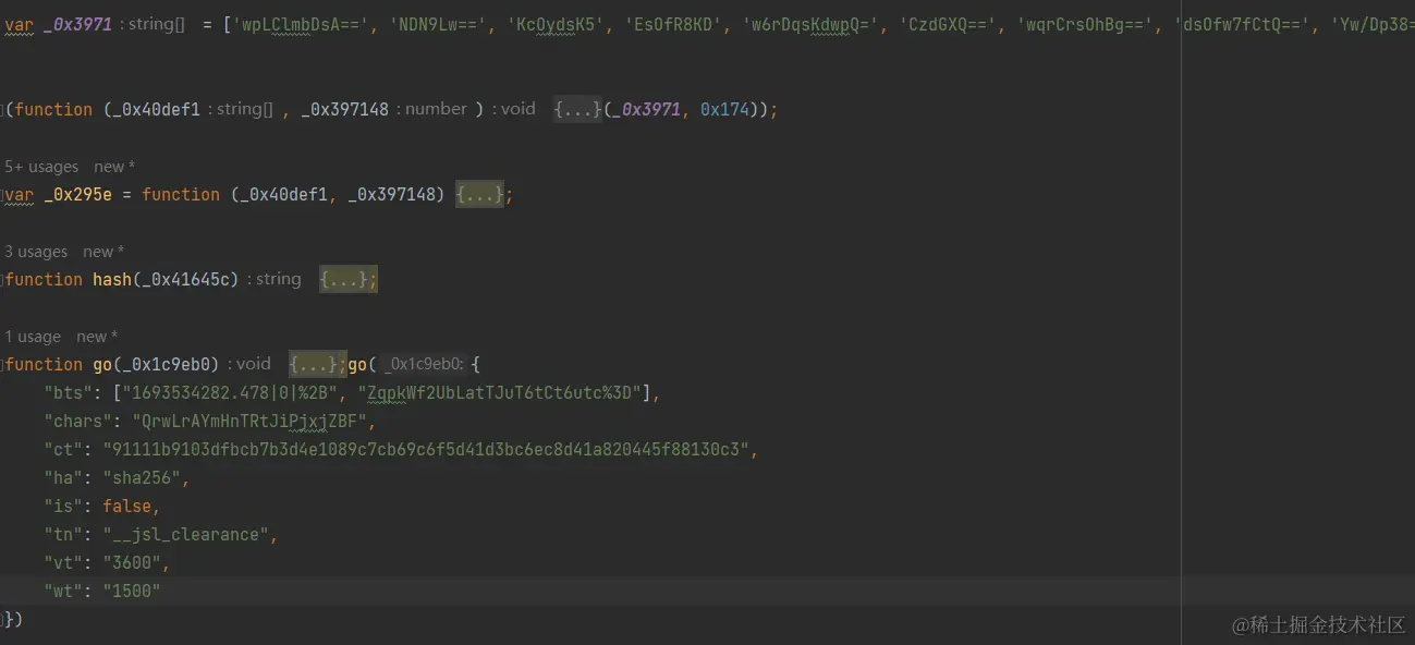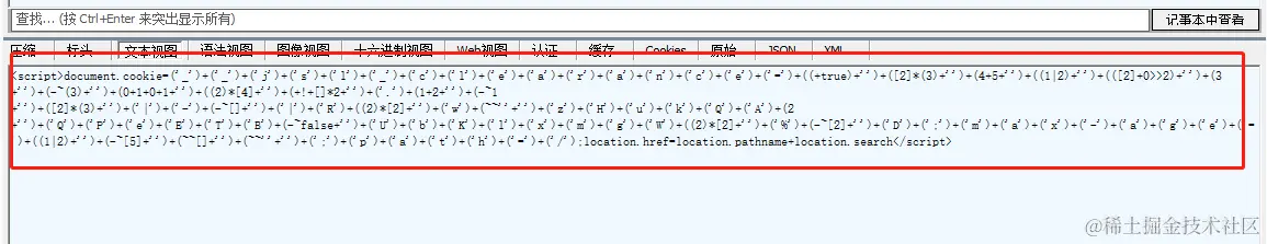 可以看到 返回给了我们的正确的内容,并且状态码为200, 那么破局关键就是上面这个所指的cookie了,也就是要解决第二次返回给我们的 混淆的JS代码。