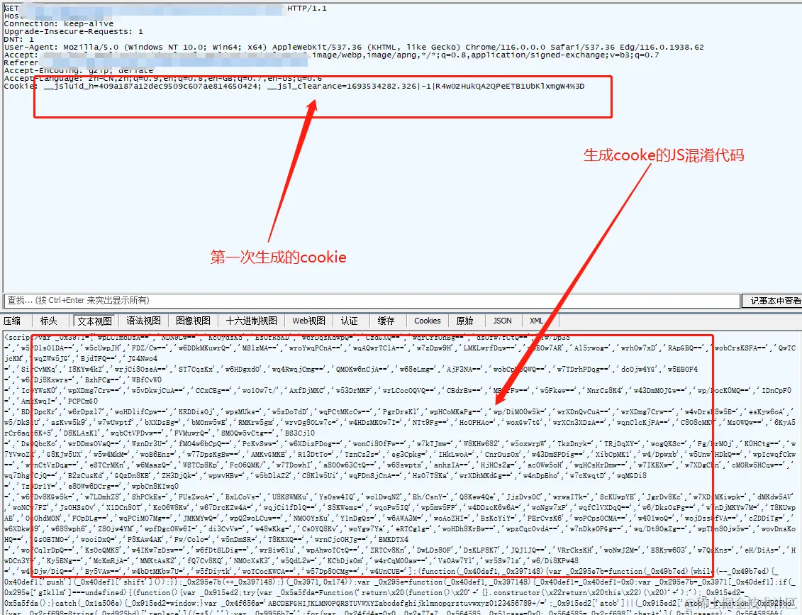 第二次jS混淆生成的cookie: __jsl_clearance=1693534282.478|0|%2BrRZqpkWf2UbLatTJuT6tCt6utc%3D;