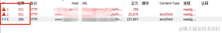 首先可以发现 网站一共发起了三次请求 两次为521状态码的请求 最后一次是200的请求 200 的请求返回了正确的数据