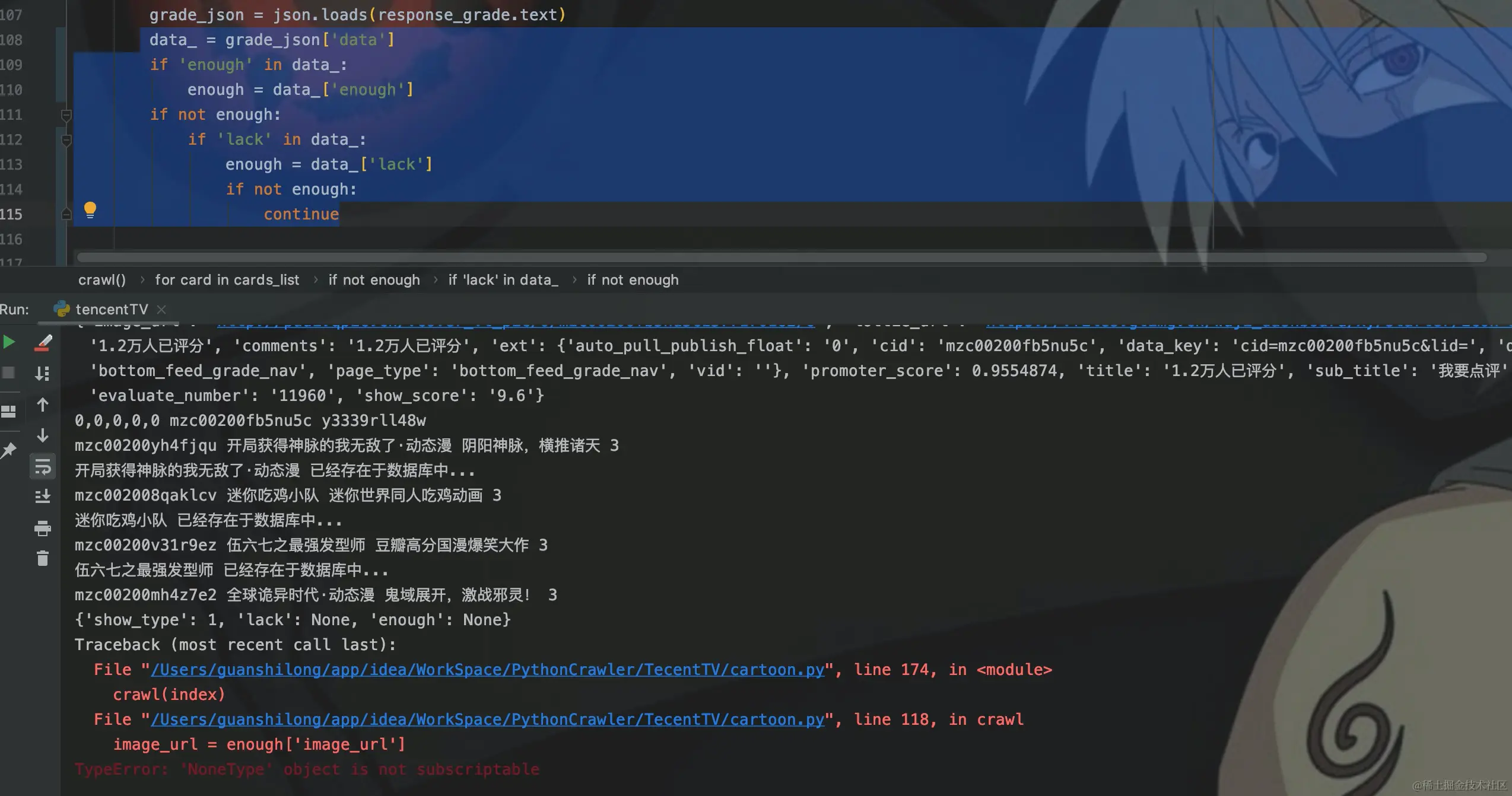 从图中可以看到,动漫信息可能是从enough或者lack字段获取,而且还有是NoneType。我对这种情况的处理就是:如果没有评分数据,通过continue跳出这个国漫信息的爬取。
