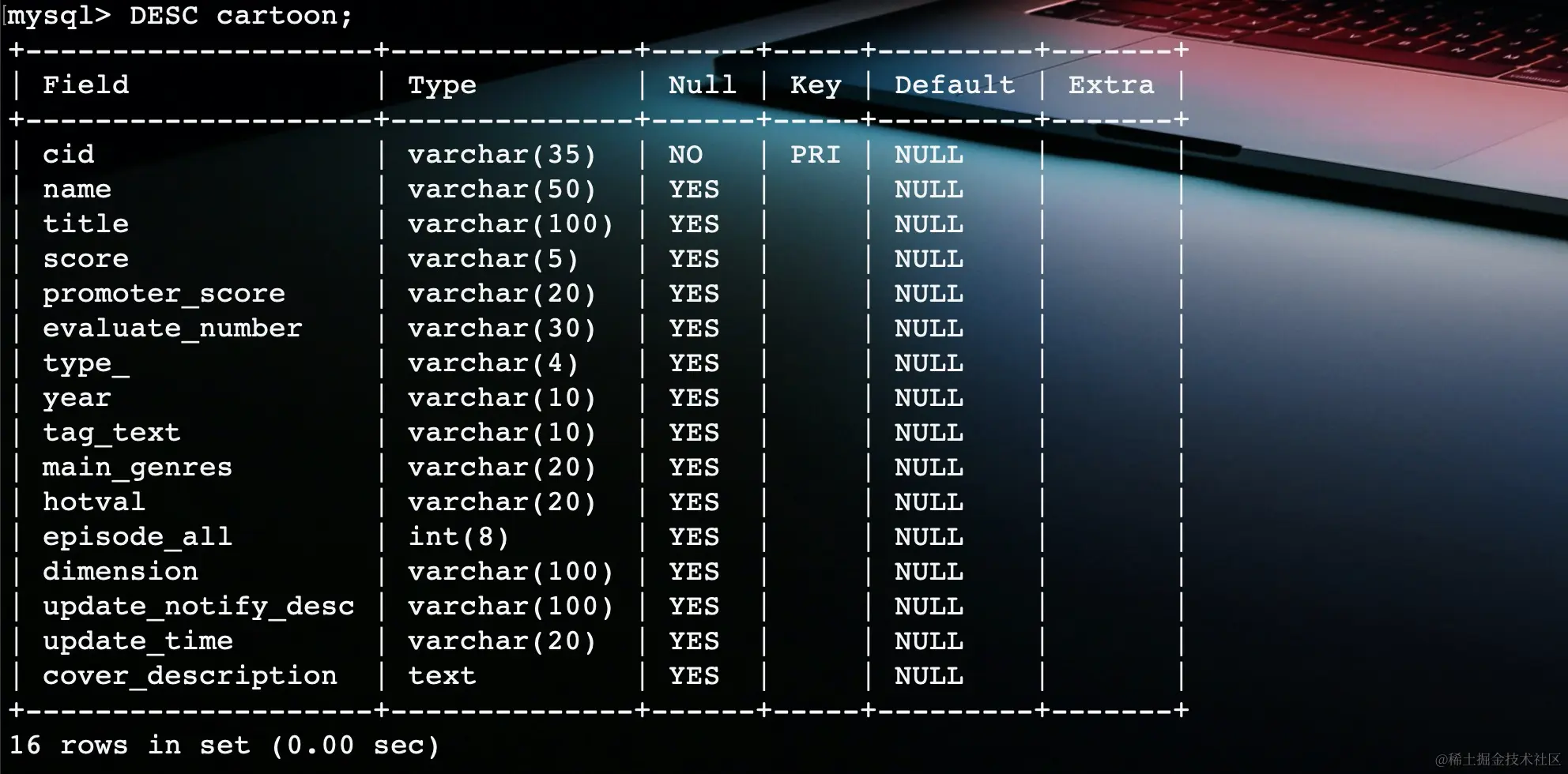 sql = f'''insert into cartoon (cid, name, title, score, promoter_score, evaluate_number, type_, year, tag_text, main_genres, hotval, episode_all, dimension, update_notify_desc, update_time, cover_description)