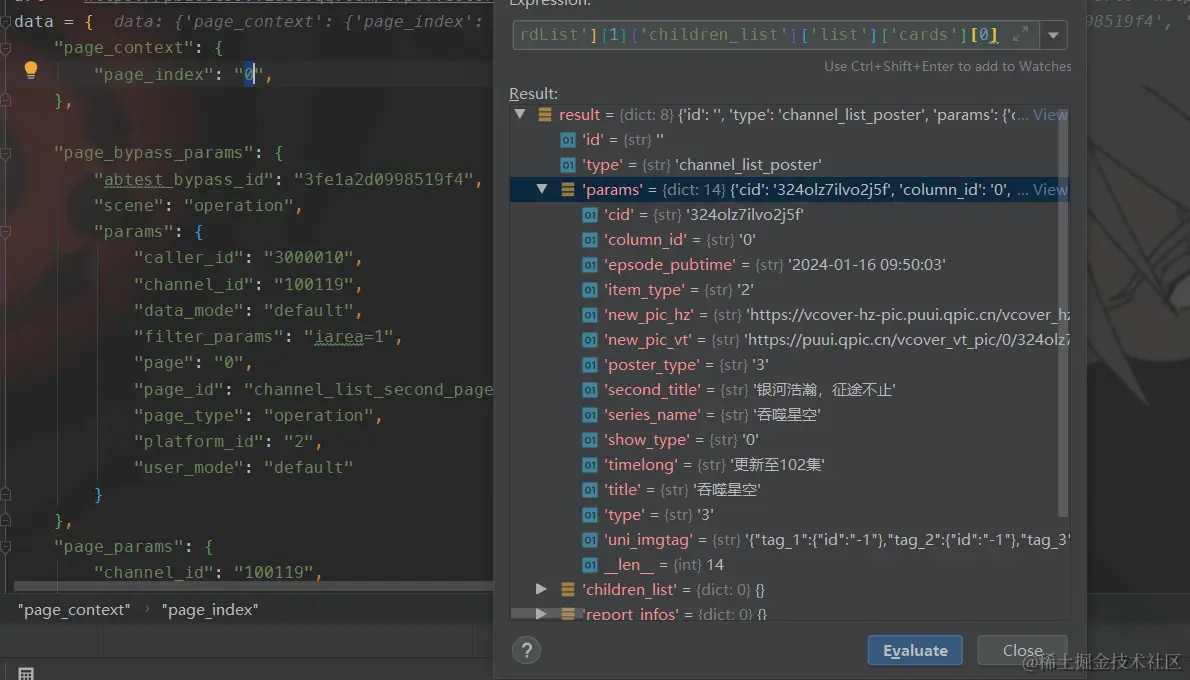 这样就将第一页前30个国漫的cid获取到了。当我修改变量获取第二页数据,即index = 1的时候,程序开始报下标越界的错误,那么应该是没有获取到数据,我们debug一下。