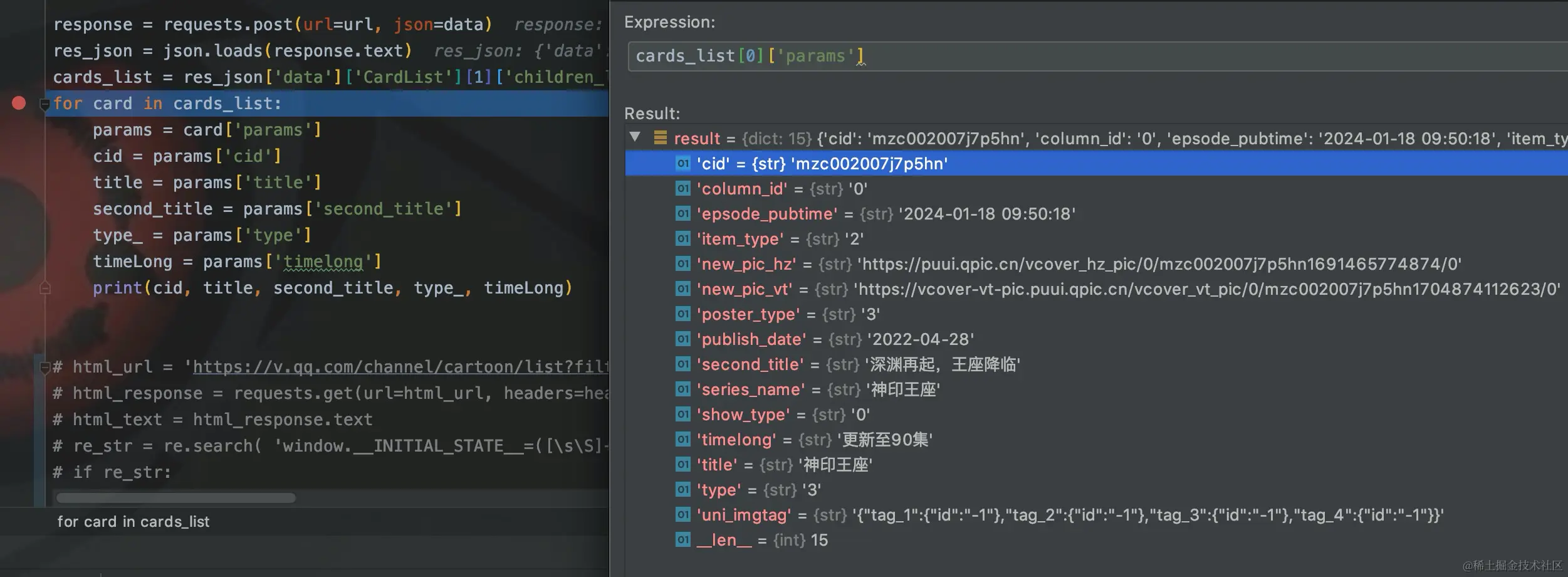 从最后一行代码可以看到,数据在CardList[1]中获取,然后层层解构,遍历获取cid。