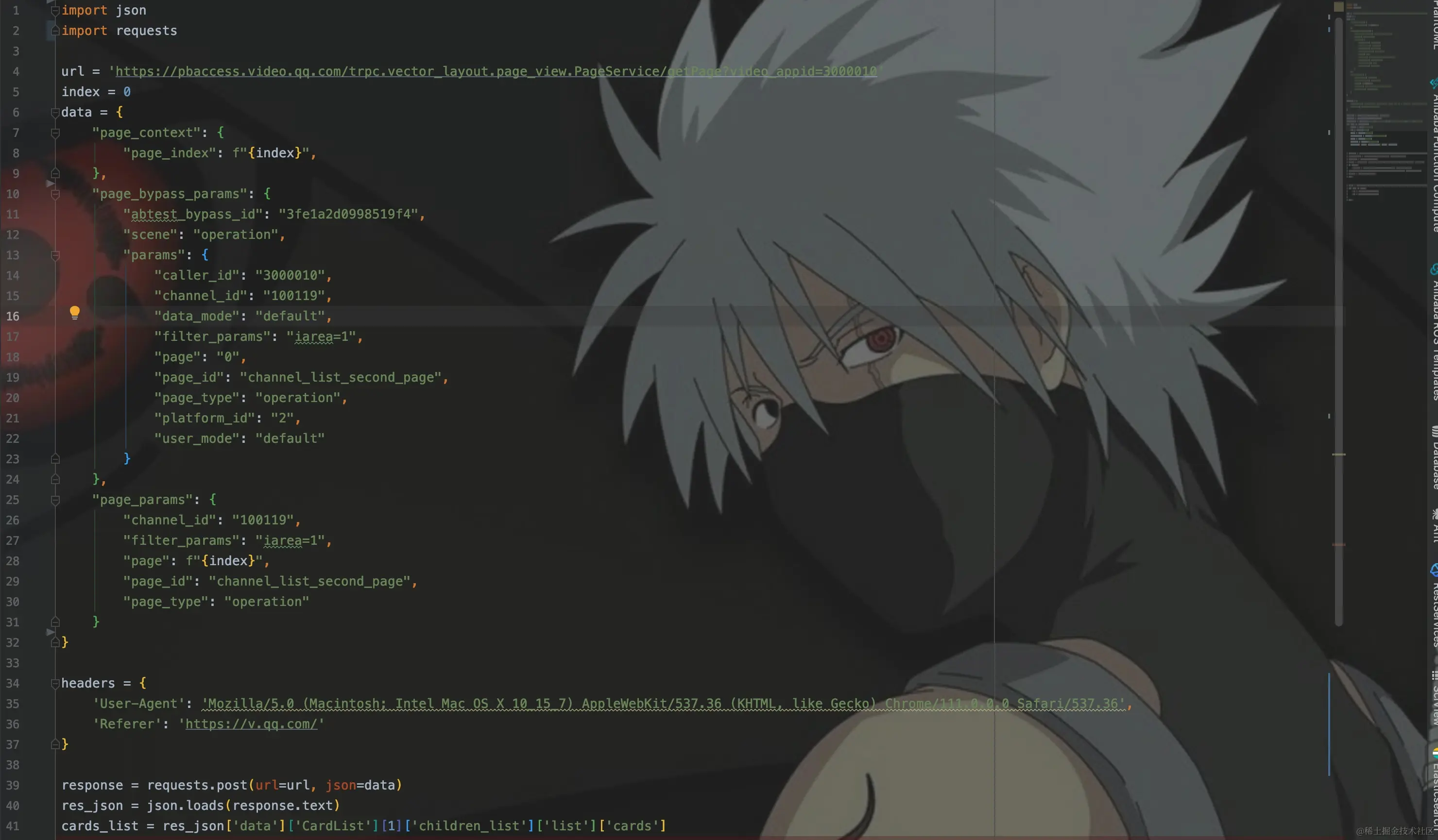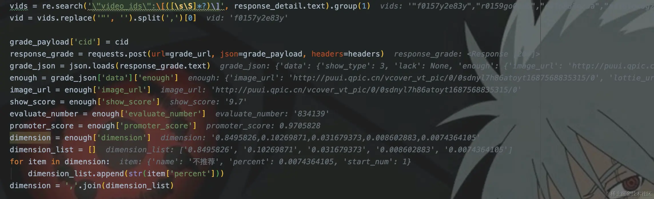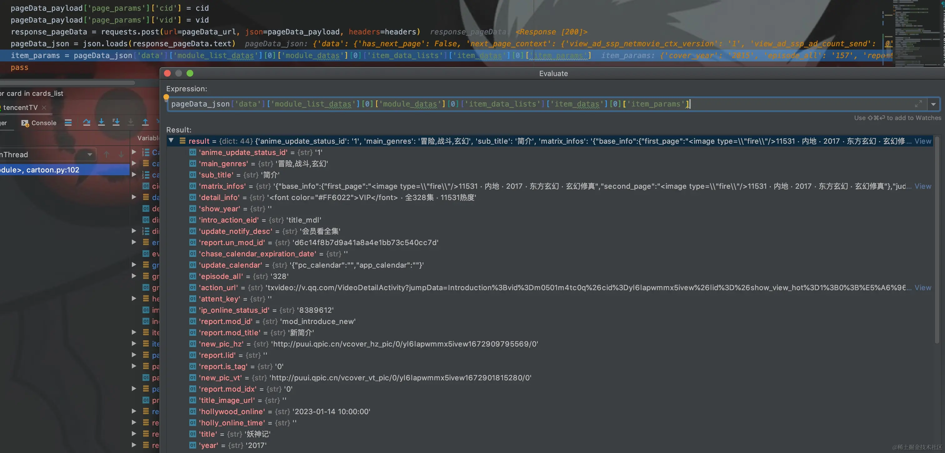 来获取image_url(封面图片url)、热度、评分、推荐区间比例等数据。接着将cid、vid(从vids列表中任取一个即可)放到动漫简介请求参数中,发起请求。