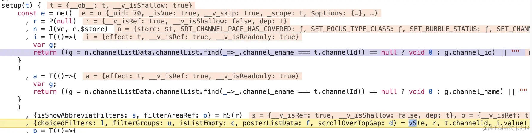 最后一行有个vS()方法,就是调用了上面的请求,i.value对应的就是形参n。i的生成可以在第五行代码中看到,用了一个lambda函数,遍历过滤n.channelListData.channleList。打印此变量: