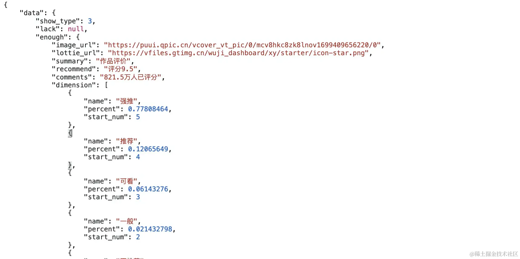 例如在解析字符串的时候,判断json里是否有这个字段,json中的json是否是NoneType,否则都会报错。下面就是针对于评分数据json的处理: