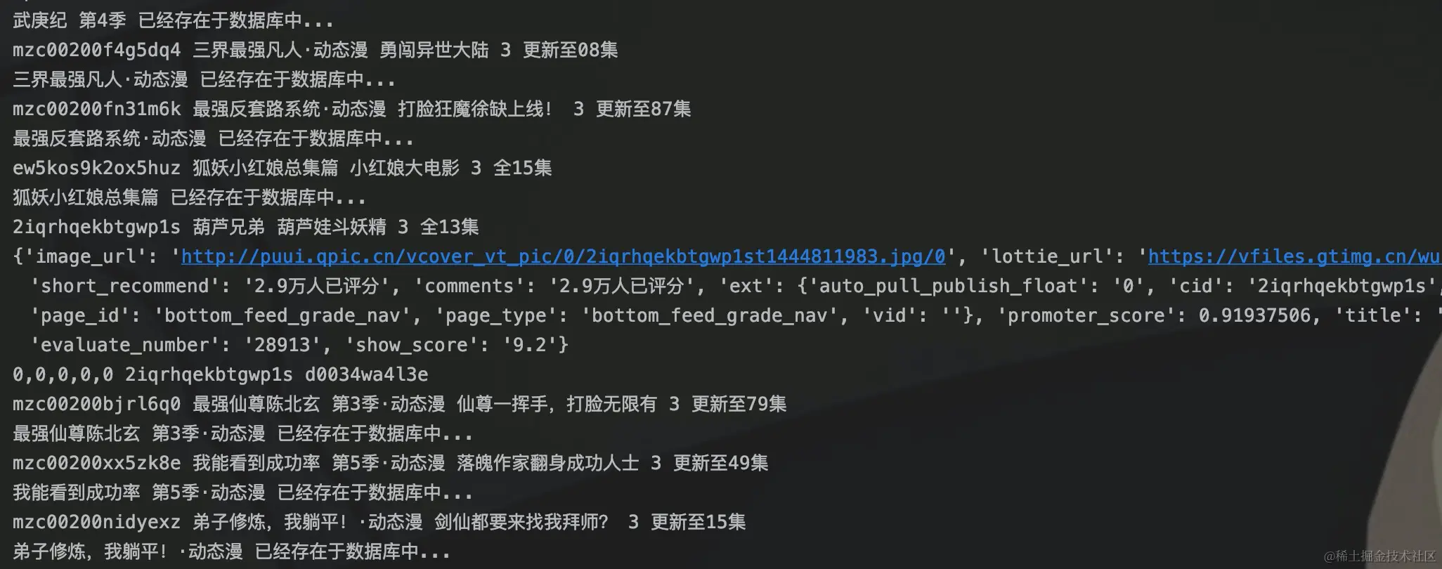 如果存在于数据库的话,可以执行update更新评分、热度等信息,这里先不实现,只是使用continue跳出循环,然后采集下一条数据。在程序的运行过程中,如果出现异常,重新启动程序,这些数据就可以避免再重新获取。