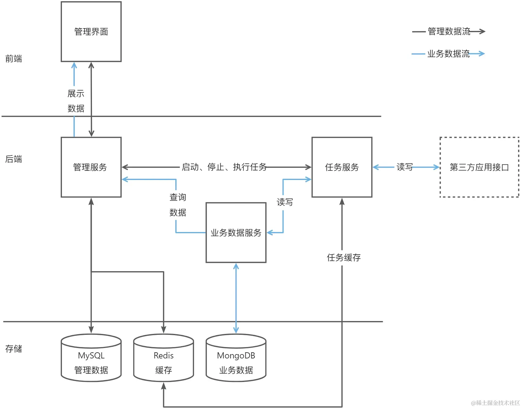 MyData的后端由3个子服务组成,分别是管理服务、任务服务、业务数据服务;