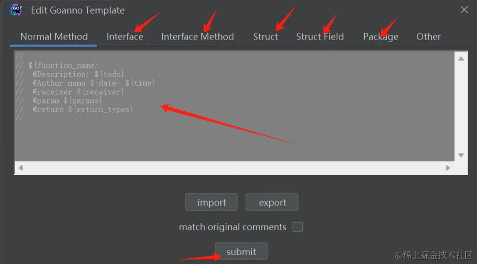 control + command + /(for windows:control + alt + /)(生成注释)Right click -> Generate -> Goanno(生成注释)- Edit comment template(编辑模板)