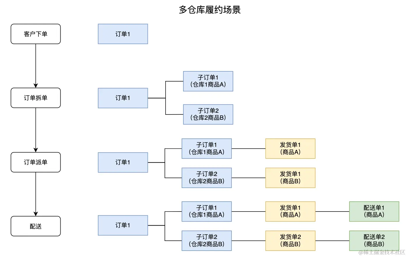 - 发货单:根据子订单生成,指导完成订单的具体履约任务,如商品的拣选、包装、出库、配送等。