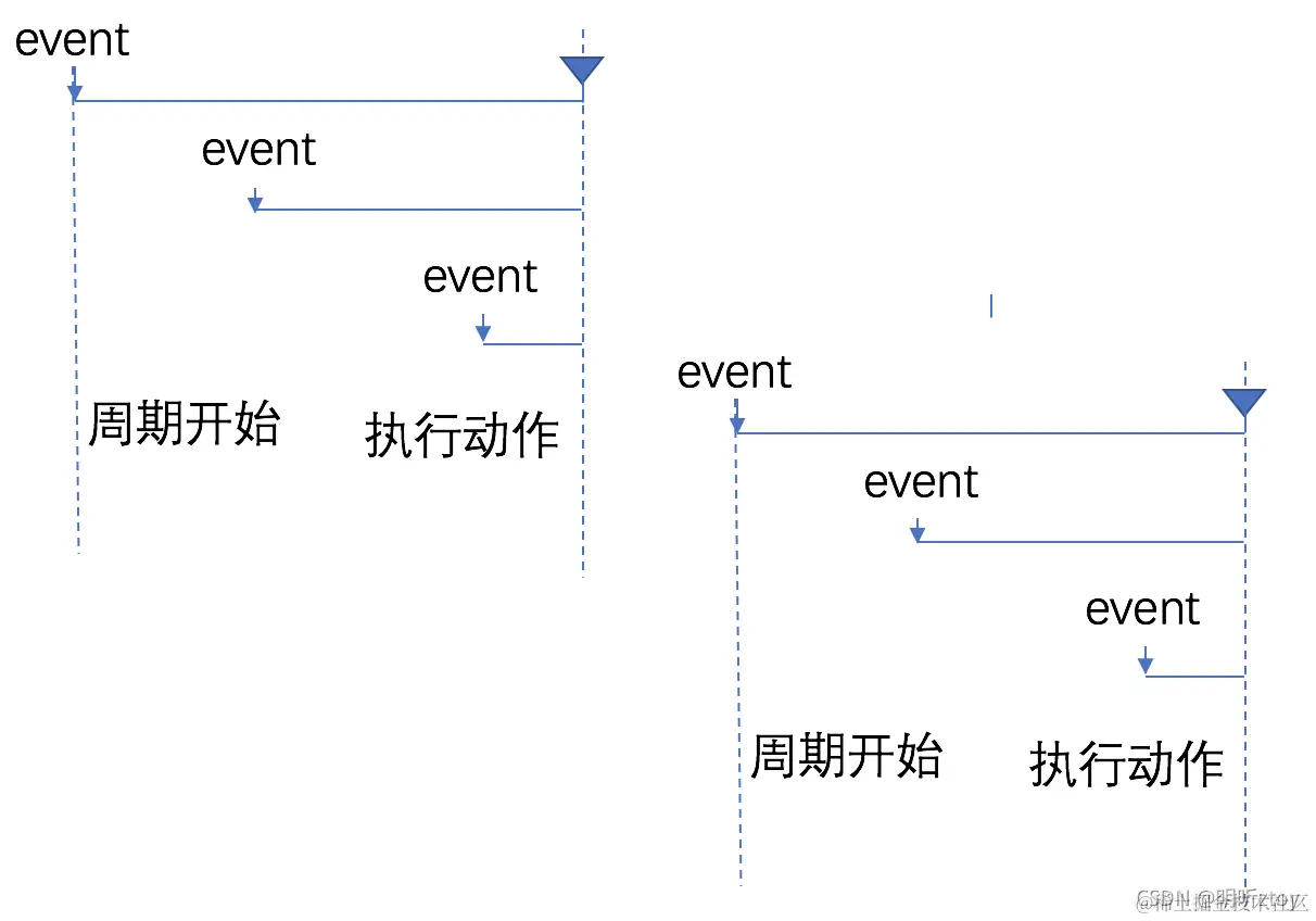 其次 使用定时器完成之间模拟时间周期。当事件触发后,如果之前的定时器存在则无视此事件;否则声明一个定时器。