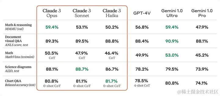 Claude 3 系列模型还具备与其他领先模型相当的视觉能力,特别是 Claude 3 Opus 在某些视觉类别上甚至超越了 Open AI的GPT-4V 和 谷歌的 Gemini 1.0 Ultra。