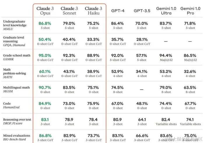 Claude 3 系列的旗舰模型———Opus,在本科和研究生水平的知识、数学技能以及处理复杂任务方面,官方称为它超越了OpenAI的GPT-4和谷歌的Gemini 1.0 Ultra。