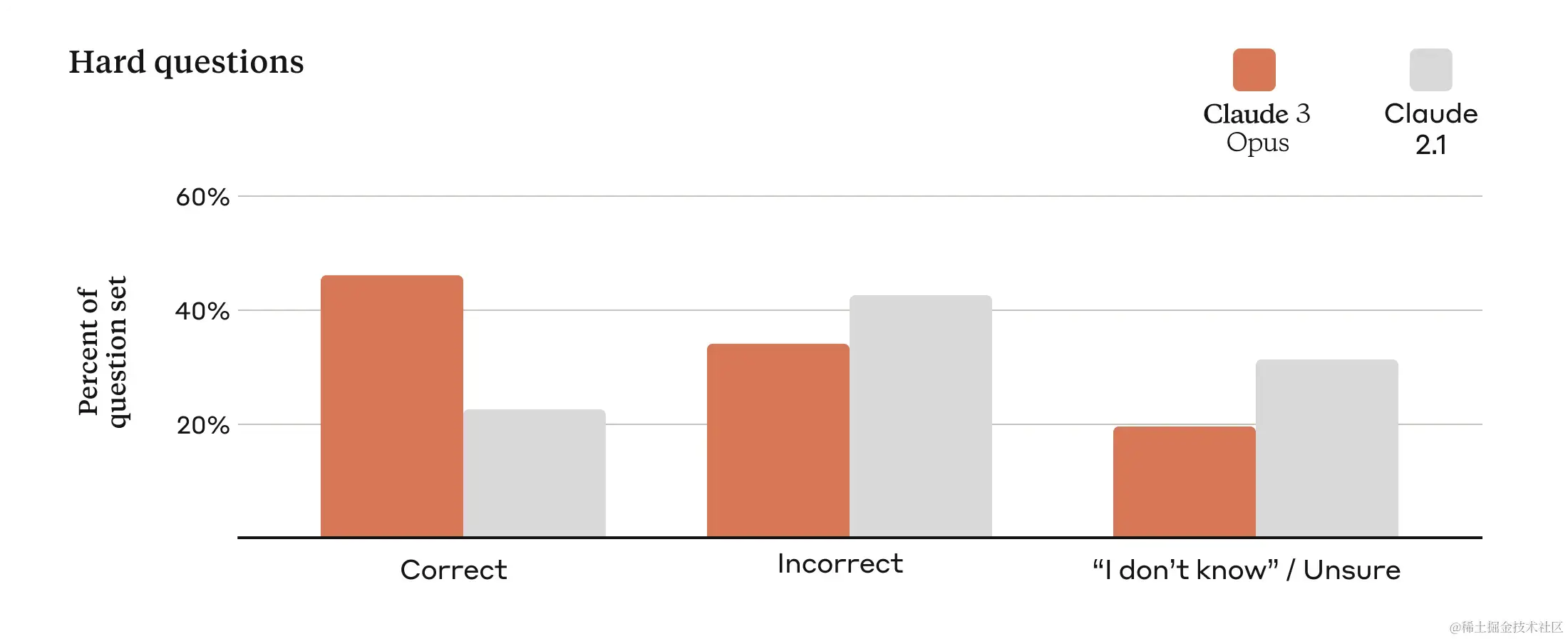 对于各种大小的企业来说,依靠我们的模型服务于他们的客户是至关重要的,这就要求我们的模型输出必须在大规模应用时仍能保持高度的准确性。我们通过一系列旨在检测当前模型已知弱点的复杂事实性问题来评估这一点。我们把这些回答分为三类:正确的答案、错误的答案(或错误联想)以及表示不确定的回答,即模型宁愿表示不知道答案也不会给出错误信息。相比于 Claude 2.1 版本,Opus 在这些挑战性问题上的准确率有了显著的提高,错误答案的比例也有所减少。