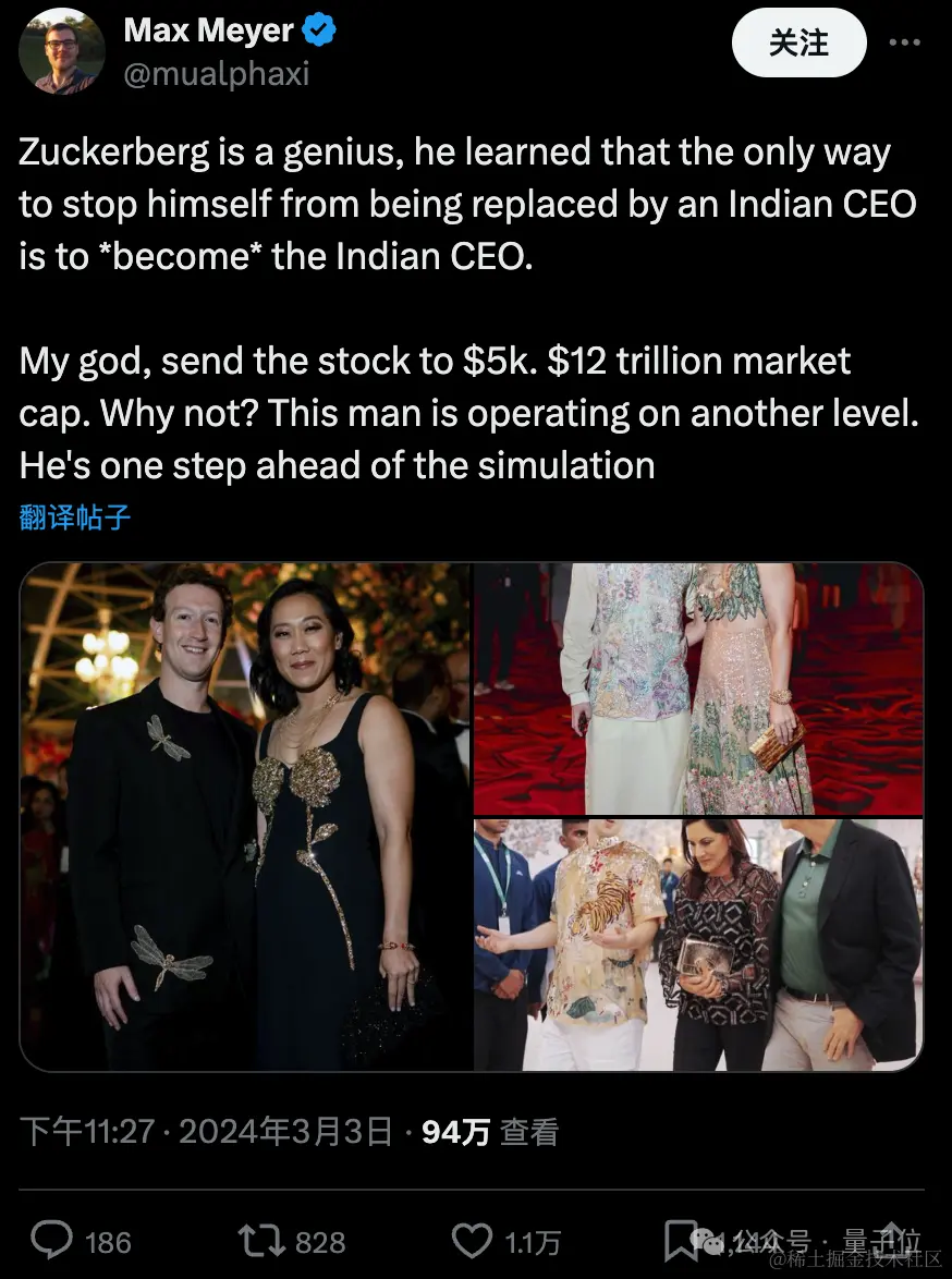 布林线下技术演讲的同时,扎克伯格正在盛装出席印度首富之子 Anant Ambani 的婚前派对。