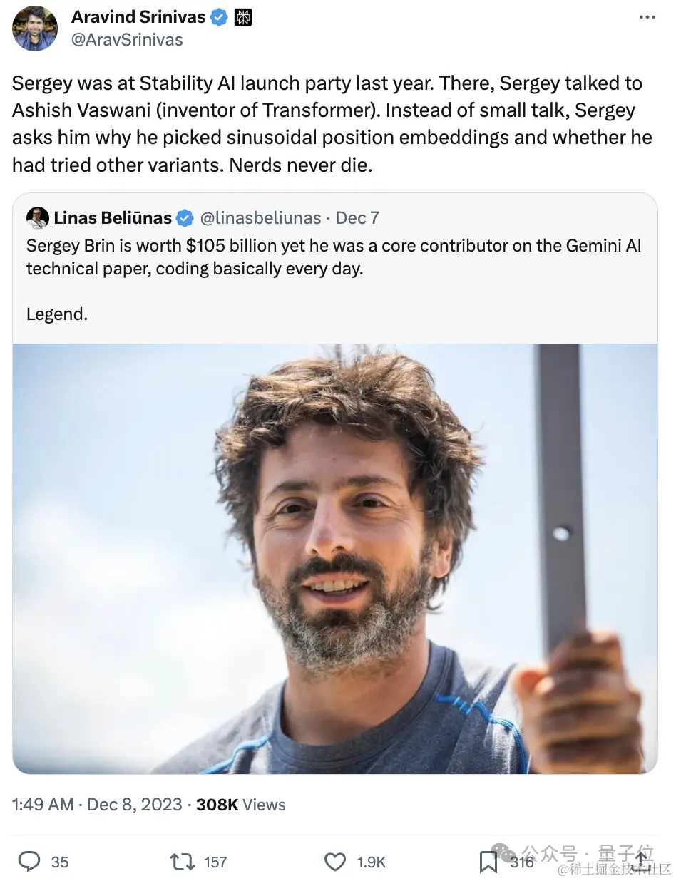 Perplexity CEO 透露,2022 年布林参加 Stability AI 发布活动,特意找到了 Transformer 架构论文作者 Ashish Vaswani 聊了两句。