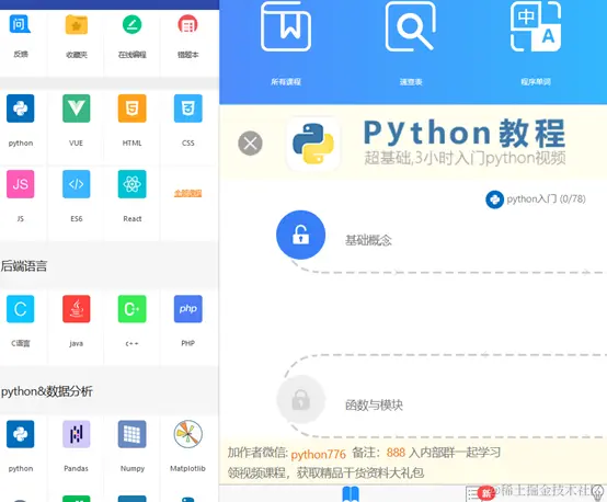 - dida100 是一个在线学习平台,提供了丰富的 Python 学习资源,包括基础语法、数据类型、函数、模块、Web 开发、数据分析等多个方面的内容.此外,该平台还提供了 Python 入门、Python 数据分析、Python Web 开发等多个课程,以及练习题和实践项目等,适合初学者和进阶者.