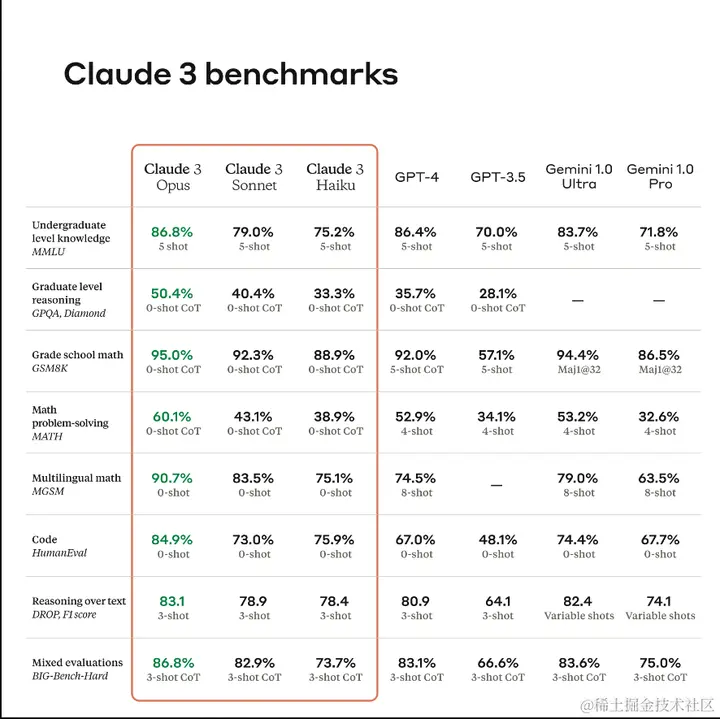 令人震惊的是,Claude3的Opus版本在多个0-shot任务上全面超越了GPT-4。在如MGSM(多语言数学推理测试)这样的任务上,Claude3以绝对优势领先,这展示了其在逻辑和推理能力上的巨大进步。