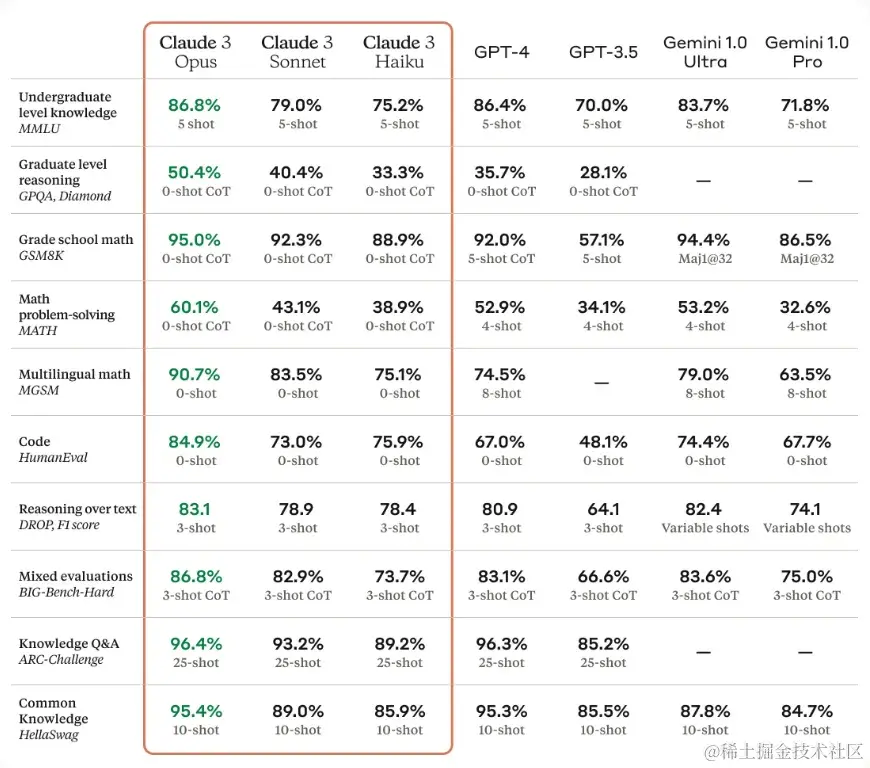 Claude 3系列模型包括Haiku(中杯)、Sonnet(大杯)与Opus(超大杯)三款,能力层次递增。在推理、数学、编码、多语言理解和视觉等领域的20项测试中,Claude 3 Opus在14项性能指标上超越了GPT-4和谷歌Gemini等一系列模型。🚀