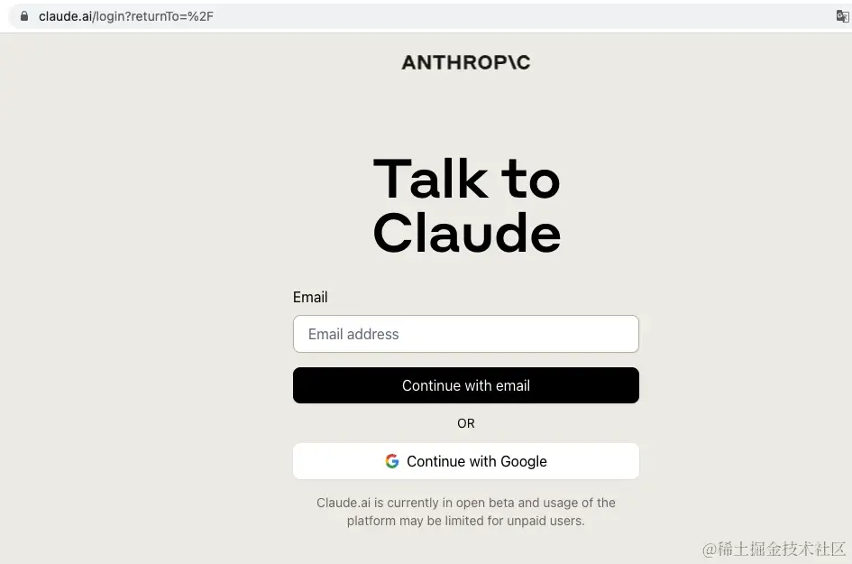 在官网注册账号 打开claude官网claude.ai/,输入你的邮箱进行注册,你可以使用国内邮箱,或者直接使用google邮箱注册: