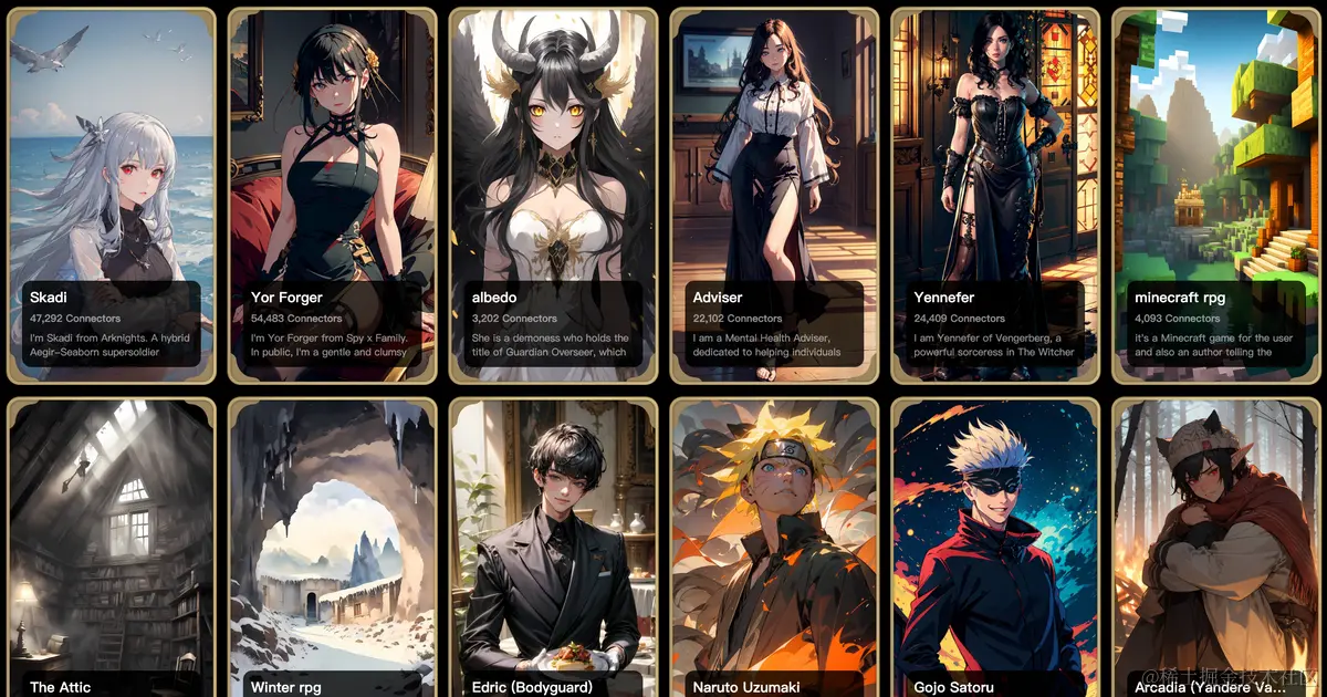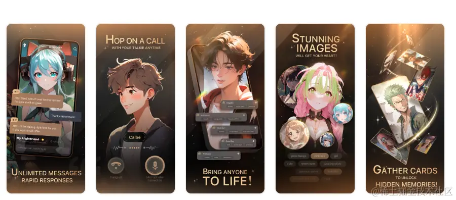 如果说AI陪聊应用的主要竞争力是给用户提供恋爱幻想,那么恋爱对象、也就是说智能体的形象塑造便是应用核心了。而根据Talkie在AppStore商店五图中展示的人气智能体角色均为当下热门动漫、游戏IP中的角色形象。即用户选择在Talkie中Cos自己喜欢的动漫角色,并将其打造为自己的暧昧对象。