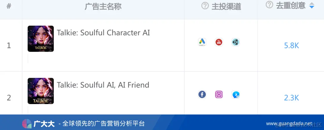 根据广大大-广告主数据,Talkie近60天双端累计去重投放广告数量超8100条,其中视频素材占比占比高达72.49%。一条仅在YouTuber平台投放5天的视频素材获得了160万次的播放曝光,点赞次数近7万次。