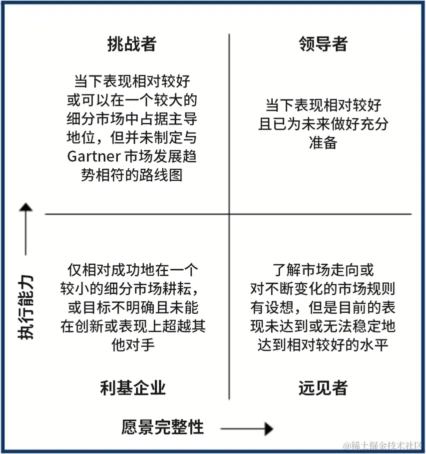“有哪些企业在主要技术市场角逐?从长远角度来看,这些企业应如何调整其定位才能为您所用?Gartner 魔力象限汇总特定市场中的诸多研究,以开阔的视角分析市场竞争者所处的相对位置。