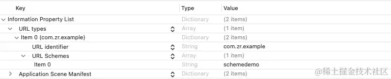 URL Schemes字段中,输入你想要使用的自定义URL Scheme。例如,本例截图设置的:schemedemo,表示应用程序可以响应schemedemo://链接。 -