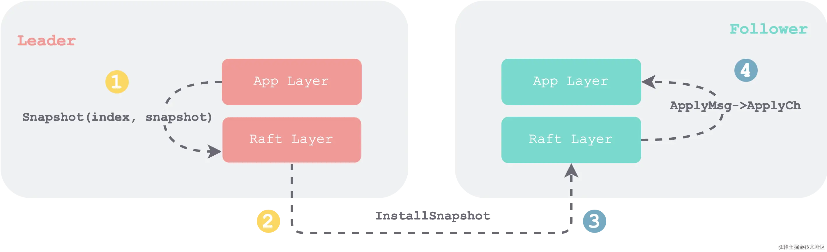 很简单,我们先将 Leader 的 Snapshot 无脑同步给 Follower,再做之后其他的日志同步。我们把这个过程引入一个新的 RPCInstallSnapshot