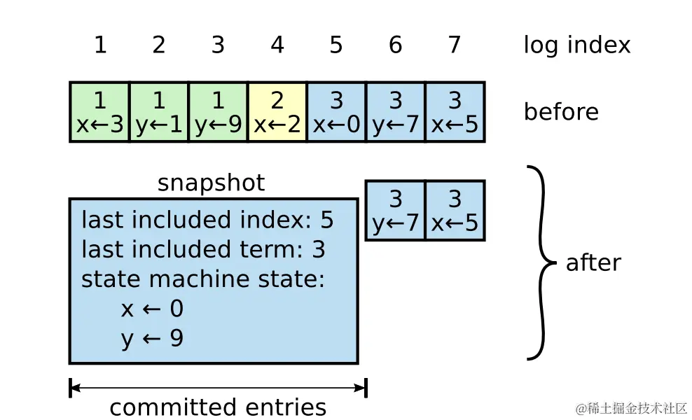 我们可以将这段日志的最后一次存储信息作为日志的快照,即 x=0,y=9。同时,我们记录最后包含的日志下标(last included index)以及其对应的任期。此时,我们的新日志仅包含未提交的部分,即 6、7,log 的长度也从 7 缩减为 2。