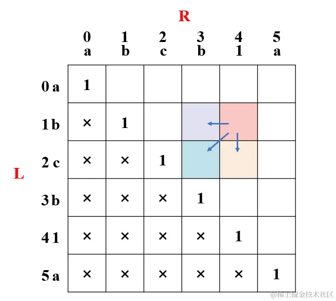 - 当字符串中仅剩一个字符时,回文长度为 1 ,其余均为 0。