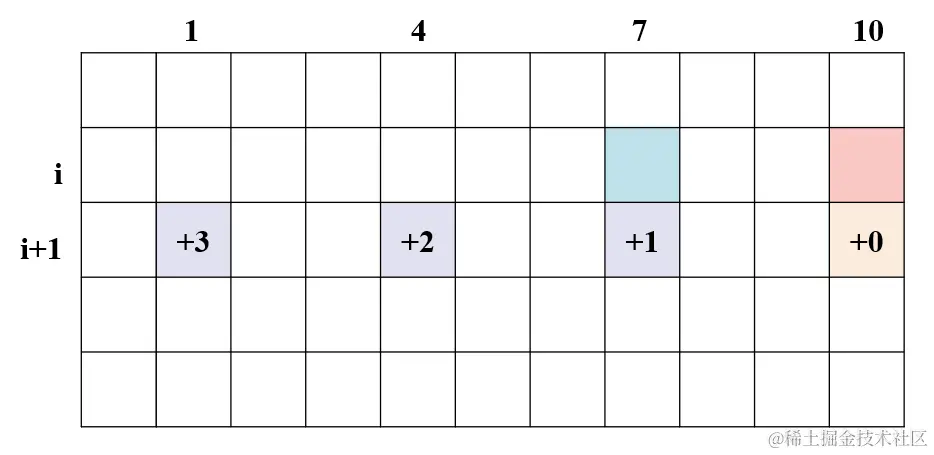 稍加思考发现,蓝色的位置即 arr[i][10 - 3] 位置的值正是 3 个紫色加完0,1,2之后的最小值。