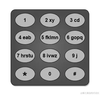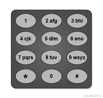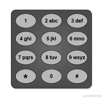 下面给出了一种电话键盘上字母到按键的映射作为示例。注意 1,*,# 和 0 不 对应任何字母。