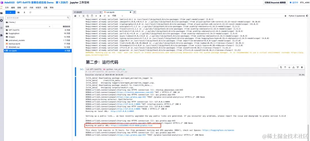 - 打开工作空间后,点击左侧「run.ipynb」,通过菜单栏中的「运行」按钮,点击「运行所有单元格」。