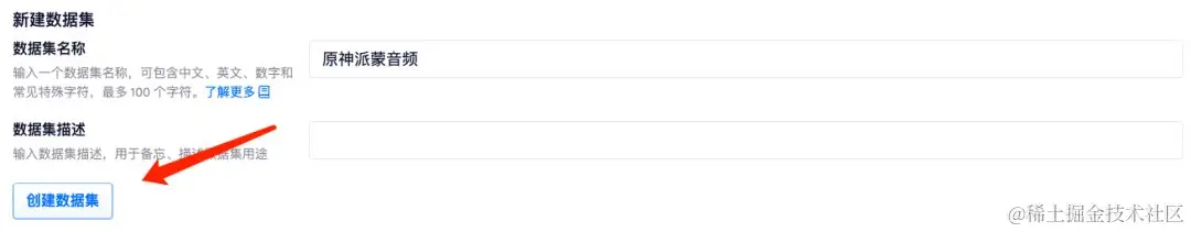 - 按照要求填写好「数据集名称」和「数据集描述后」,点击「创建数据集」。