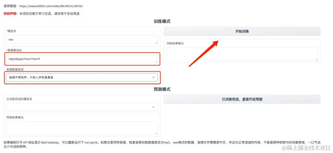 - 在「数据集地址」模块内填写本次想要克隆声音的数据集地址,选择音频数据类型后,点击「开始训练」,待输出结果显示为「模型正在开启预测,请稍后」,回到「run.ipynb」,即可看到显示「GPT 训练完成」。