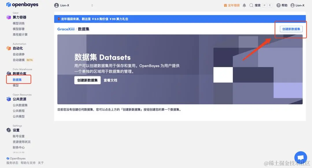 - 如果想自定义克隆音色,需要创建全新的数据集。通过左侧菜单栏中的「数据集」后,点击「创建新数据集」。