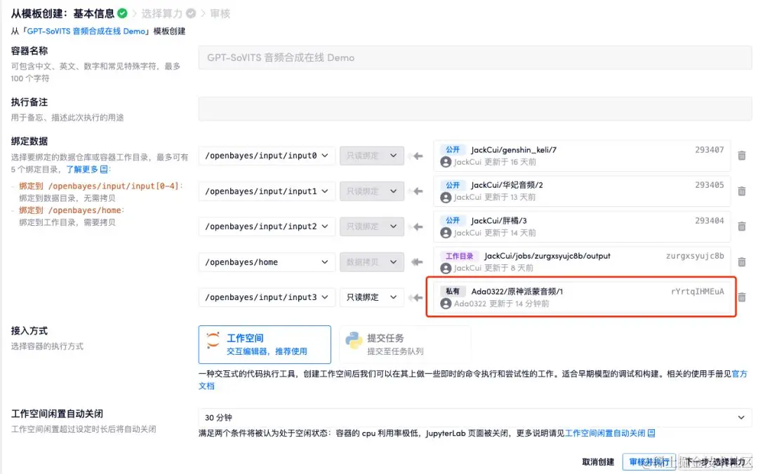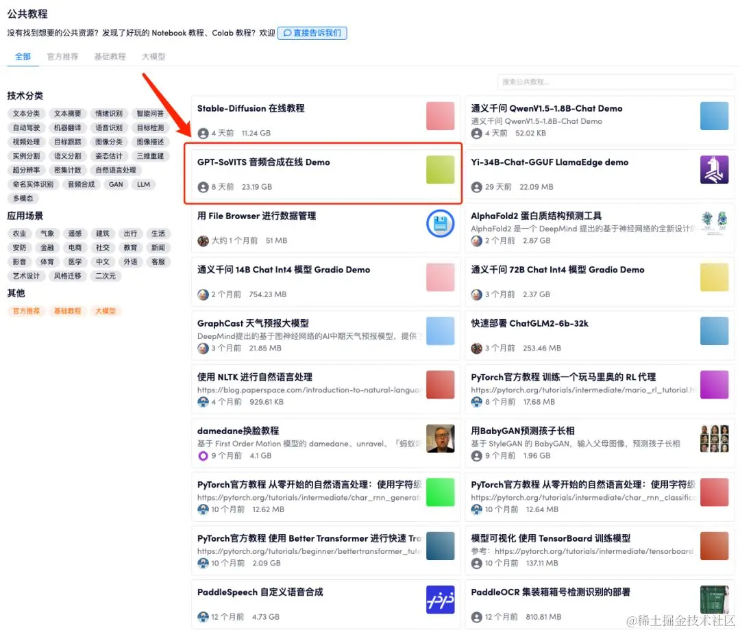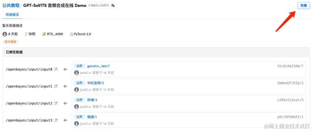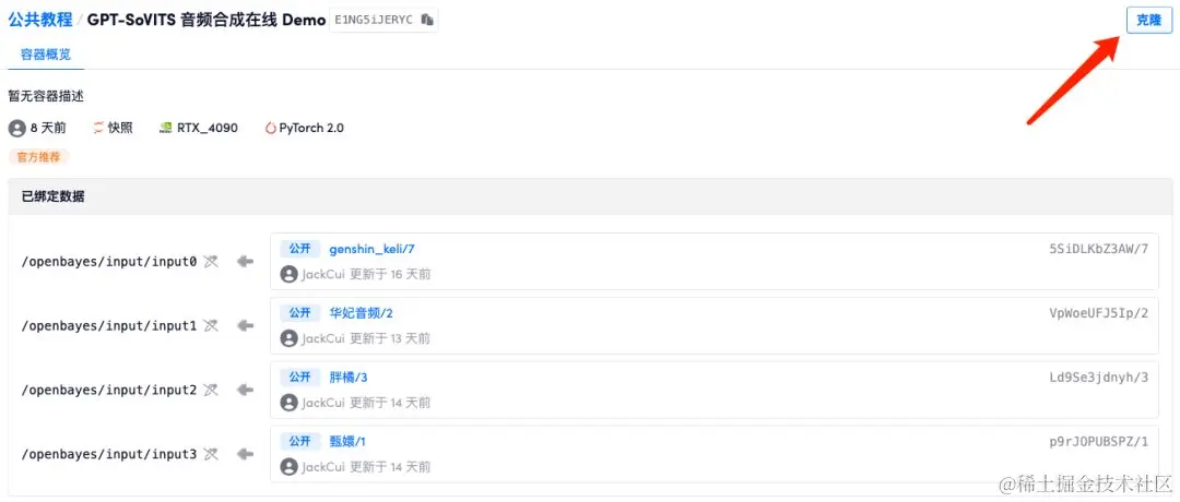 - 数据准备完成后,在左侧菜单栏「公共教程」中,打开「GPT-SoVITS 音频合成在线 Demo」,回到该教程页面,再点击右上角「克隆」,将教程克隆至自己的容器中。