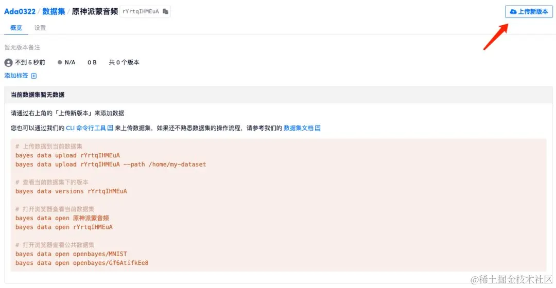 - 创建完成后,点击右上角「上传新版本」,将想要克隆的音频文件上传。