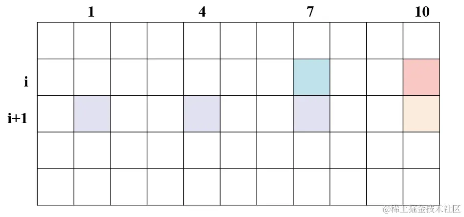 稍加思考发现,蓝色的位置即 arr[i][10 - 3] 位置的值正是 3 个紫色的总和。那么,就可以将 红色 = 黄色 + 3 个紫色,改为 红色 = 黄色 + 蓝色,这样就不需要一直往前寻找了,减少一个 for 循环。