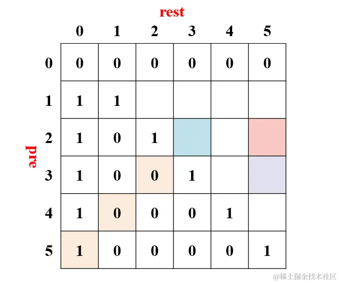 蓝色:把 5 裂开一个 2 后,rest=3 。(蓝行=红行,蓝列=红列-红行)。