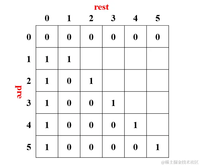 可变的参数有两个:前一个数 pre 和 剩余数 rest 。因此,需要设置一个二维的 dp 表数组,由于 pre, rest 的取值范围均为 0~n ,因此数组大小设置为 dp[n + 1][n + 1] 。第一列和对角线均为 1 。