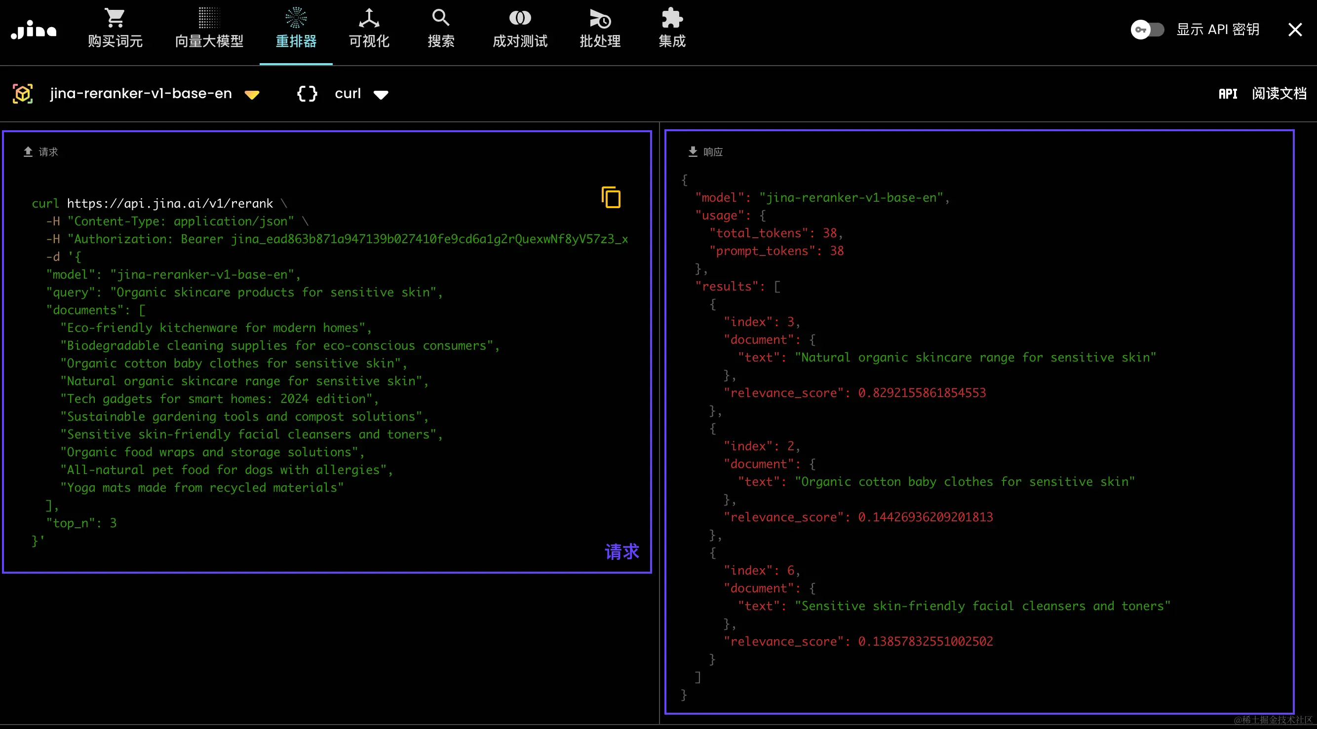 如图所示,只需输入查询内容和相关文档(目前只支持英文文本),系统便会迅速返回包含文档相关性得分的 JSON 格式响应,让您一目了然地看到搜索结果的优化排序。我们提供 100 万 Token 免费试用额度,助您轻松验证 Jina Reranker 对搜索效果的显著改善。