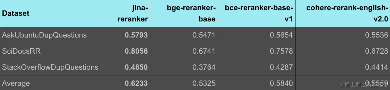 在 MTEB 的 Reranker 任务上进行测试,Jina Reranker 表现同样出色,表现领先其他模型。
