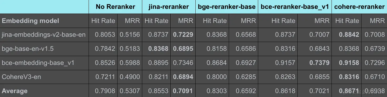 我们复现了 LlamaIndex 的 RAG 模型评估实验,评估了 RAG 任务中不同 Embeddings 和 Reranker 模型的组合效果。可以看到,在 Jina Reranker 加持下,平均命中率提升了 7.9%,MRR 提升了 33.7%。
